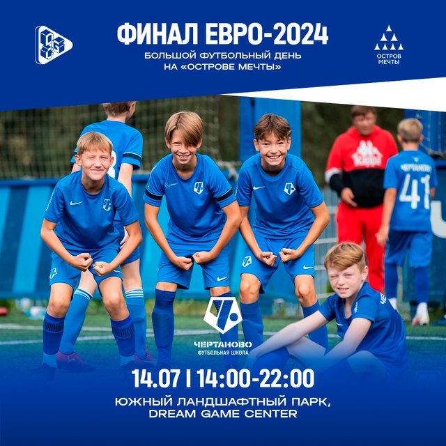 14 июля, в день финала чемпионата Европы по футболу, Футбольная Академия «Чертаново» и «Остров Мечты» проведут Большой футбольный день для гостей парка. Мероприятия пройдут в южном ландшафтном парке и Dream Game Center «Острова Мечты» по адресу: проспект Андропова, д.1.