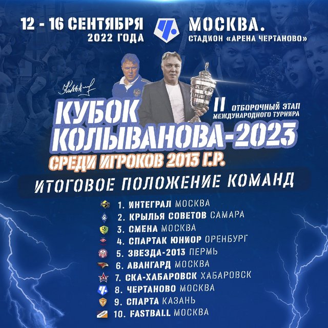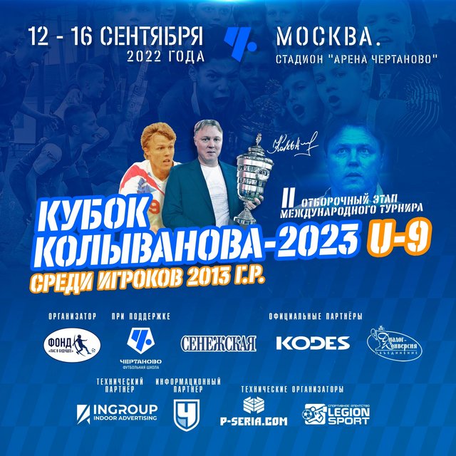 С 12 по 16 сентября в Москве проходил II отборочный этап «Кубка Колыванова-2023» среди мальчиков 2013 г.р. Все матчи прошли на стадионе «Арена Чертаново» (Москва, Сумской проезд, д.26). В турнире приняли участие 10 команд, которые сыграли между собой в один круг («каждый с каждым»). Прямые трансляции на канале Чертаново ТВ в YouTube.