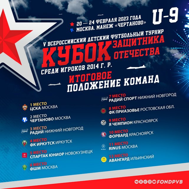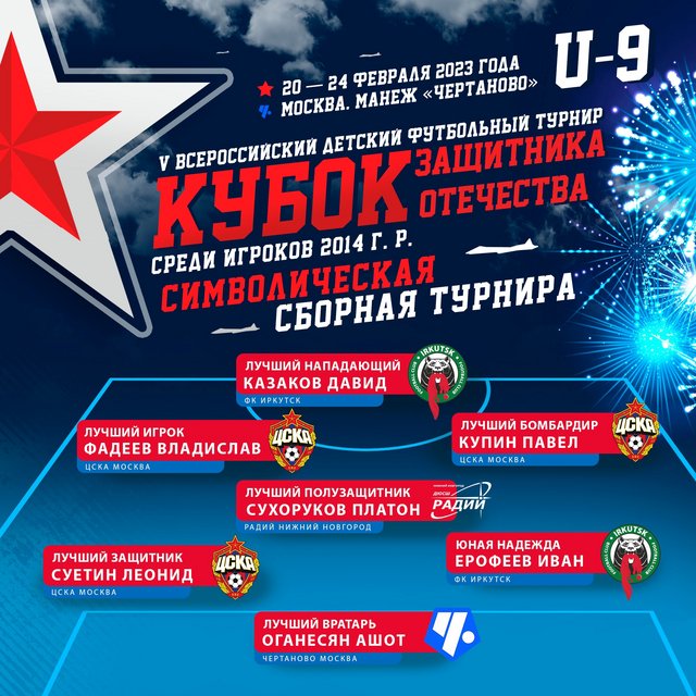 С 20 по 24 февраля в Москве проходил V Всероссийский детский футбольный турнир «Кубок защитника Отечества» U-9 среди мальчиков 2014 г.р. Соревнования принимал манеж школы «Чертаново» (Москва, ул. Чертановская, д.7, кор.3). Турнир проводился уже в пятый раз подряд. В предыдущих розыгрышах приняли участие 75 команд из нескольких десятков городов России — от Санкт-Петербурга и Краснодара до Владивостока и Благовещенска.