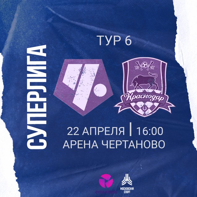 В субботу, 22 апреля, состоится матч 6-го тура: ЖФК «Чертаново» сыграет дома с ЖФК «Краснодар». Встреча пройдёт на стадионе «Арена Чертаново» (Москва, Сумской проезд, д.26). Начало в 16:00. Кстати, у нас большой игровой день: чуть ранее сыграет наша мужская команда с «Ленинградцем» (13:00). Приходите – всех ждём!