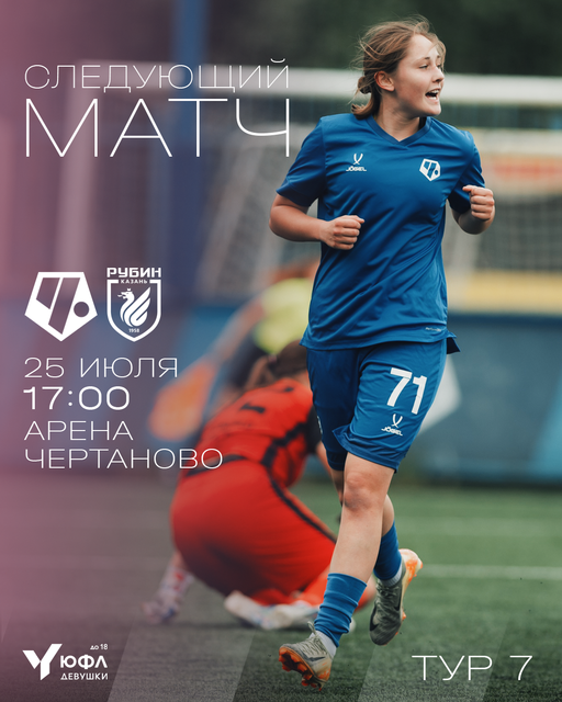 Лидируем в турнире ЮФЛ-Девушки U-18 – есть желание укрепиться на первом месте! В пятницу, 25 июля, в рамках 7-го тура команда девушек «Чертаново» 2008/09 г.р. сыграет дома с казанским «Рубином». Встреча пройдёт на стадионе «Арена Чертаново» (Москва, Сумской проезд, д.26). Начало в 17:00. Вход для болельщиков – свободный. Будет интересно!