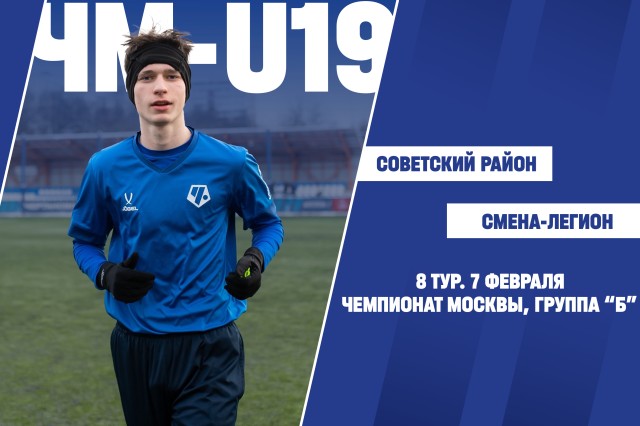 Продолжается Чемпионат Москвы U-19! В пятницу, 6 февраля, в рамках 8-го тура воспитанники «Советского района» сыграют с командой «Смена-Легион». Матч пройдет на стадионе «Ясенево». Начало в 18:30
