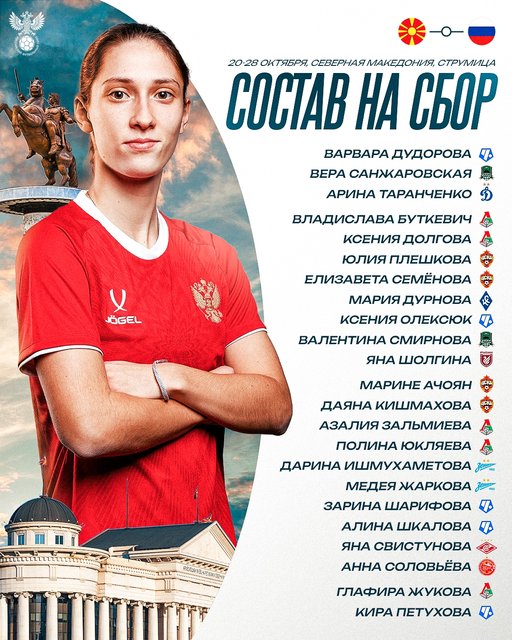 В молодёжку U-19 приглашены Юлиана Каморина, Вероника Ткаченко, Виктория Беляева, Виктория Крюкова, Юлия Соболева и Елизавета Груздева, а также две воспитанницы нашей академии (Мария Нечаева, Анастасия Каратаева). Молодёжная сборная (тренер Елена Медведь) сыграет два товарищеских матча с ровесницами из Северной Македонии на стадионе «Горан Пандев» в городе Струмица (24 октября, 12:00; 27 октября, 13:00).