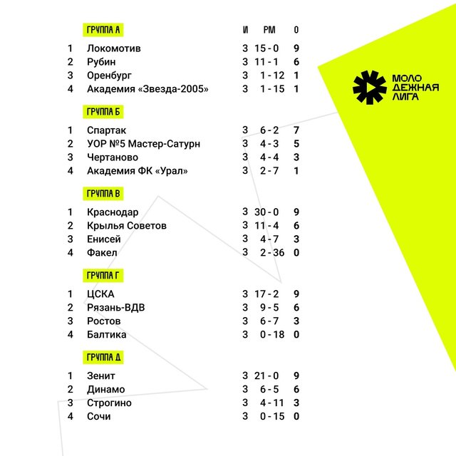 В сезоне-2024 в Молодежной лиге U-21 принимают участие 20 молодёжных команд, которые сыграют в два этапа. На первой стадии все команды разделены на 5 групп, где сыграют дома и в гостях с каждым из соперников (6 туров). Команды, занявшие первое и второе места в своих группах, выйдут в группу I (за 1-10 места), а оставшиеся образуют группу II (за 11-20 места) – плюс ещё 16 туров. Следите за турнирной таблицей и календарем матчей на официальном сайте лиги.