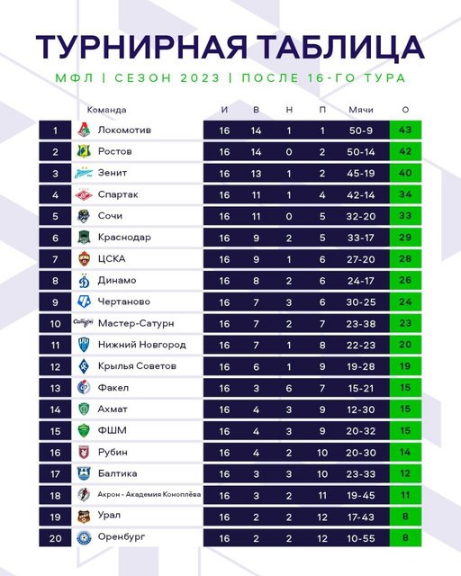 В «переходном» сезоне-2023 в МФЛ принимают участие 16 молодёжных команд клубов РПЛ («Зенит», ЦСКА, «Спартак», «Ростов», «Ахмат», «Краснодар», «Оренбург», «Локомотив», «Динамо», «Сочи», «Урал», «Крылья Советов», «Нижний Новгород», «Факел», «Рубин», «Балтика»), а также 4 лучшие команды ЮФЛ-1 по итогам минувшего сезона («Акрон-Академия Коноплёва», ФШМ, «Чертаново», «Мастер-Сатурн»). Результаты, расписание и положение смотрите на официальном сайте лиги!