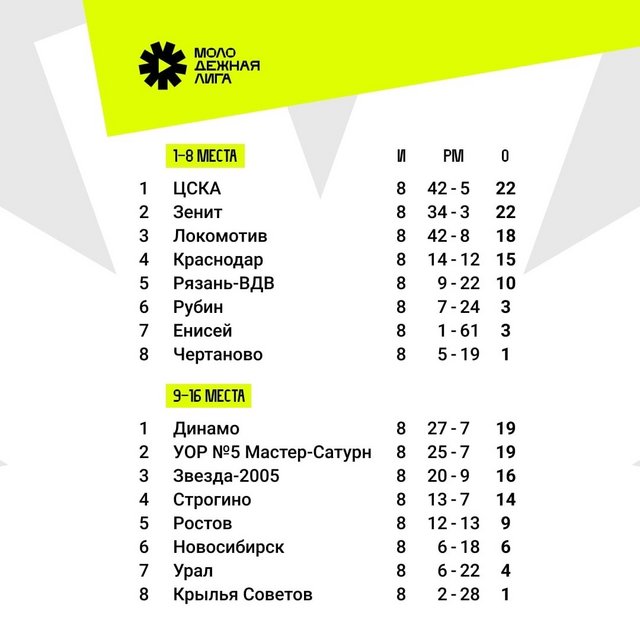 В связи с увеличением общего количества участников, турнир Молодёжной Лиги проходит в две стадии: на первой стадии команды сыграли в два круга в группах А и Б (по восемь команд), а теперь команды, занявшие первые четыре места в своих группах разыгрывают между собой 1-8 места (в то же время, команды, занявшие 5-8 места спорят за 9-16 места). Следите за турнирной таблицей и календарем матчей на официальном сайте лиги.