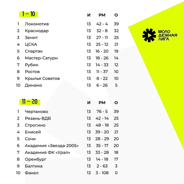 В сезоне-2024 в Молодежной Лиге U-21 принимают участие 20 молодёжных команд. На первой стадии все команды были разделены на 5 групп, где сыграли дома и в гостях с каждым из соперников (6 туров). Во второй этап каждая команда перешла с сохранением набранных очков, забитых и пропущенных мячей в матчах против соперника, с которым уже встречалась ранее. Команды, занявшие первое и второе места в своих группах, вышли в группу I (за 1-10 места), а оставшиеся образовали группу II (за 11-20 места) – плюс ещё 16 туров. Следите за турнирной таблицей и календарем матчей на официальном сайте лиги.