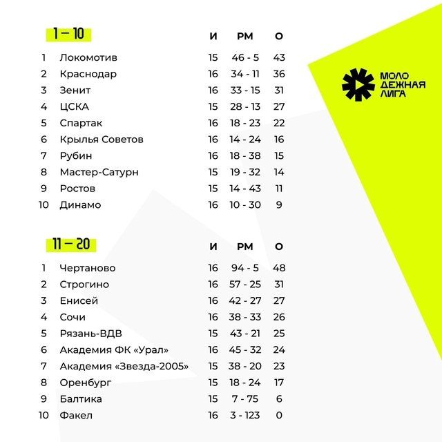 В сезоне-2024 в Молодежной Лиге U-21 принимают участие 20 молодёжных команд. На первой стадии все команды были разделены на 5 групп, где сыграли дома и в гостях с каждым из соперников (6 туров). Во второй этап каждая команда перешла с сохранением набранных очков, забитых и пропущенных мячей в матчах против соперника, с которым уже встречалась ранее. Команды, занявшие первое и второе места в своих группах, вышли в группу I (за 1-10 места), а оставшиеся образовали группу II (за 11-20 места) – плюс ещё 16 туров. Следите за турнирной таблицей и календарем матчей на официальном сайте лиги.