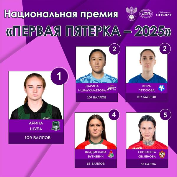 Детская футбольная лига имени Виктора Горлова подвела итоги голосования в рамках ХXIII ежегодной национальной премии «Первая пятерка»: форвард ЖФК «Чертаново» Кира Петухова финишировала на 2-м месте (вместе с Дариной Ишмухаметовой), всего на пару очков отстав от победительницы – лучшей молодой футболисткой Суперлиги в 2025 году признана Арина Шуба.