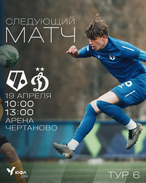 Сезон в Юношеской Футбольной Лиге набирает обороты: стартовый отрезок преодолели, впереди еще долгий, но крайне интересный и насыщенный путь! В 6-м туре чертановцы проведут принципиальные встречи с воспитанниками Академии «Динамо»! Матчи пройдут в субботу, 19 апреля, на стадионе «Арена Чертаново» (Сумской проезд, д.26): ЮФЛ-3 – 10:00, ЮФЛ-1 – 13:00.